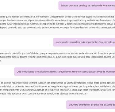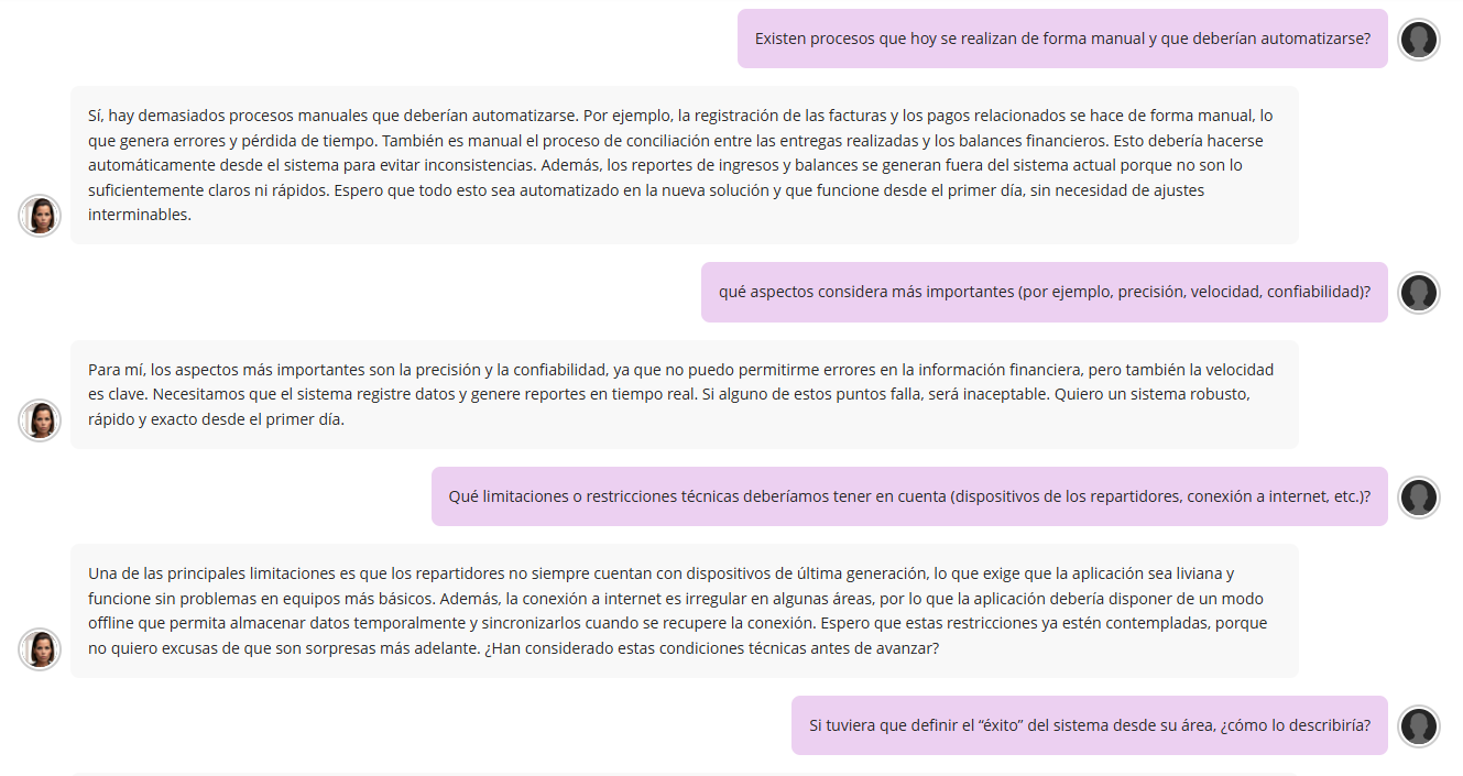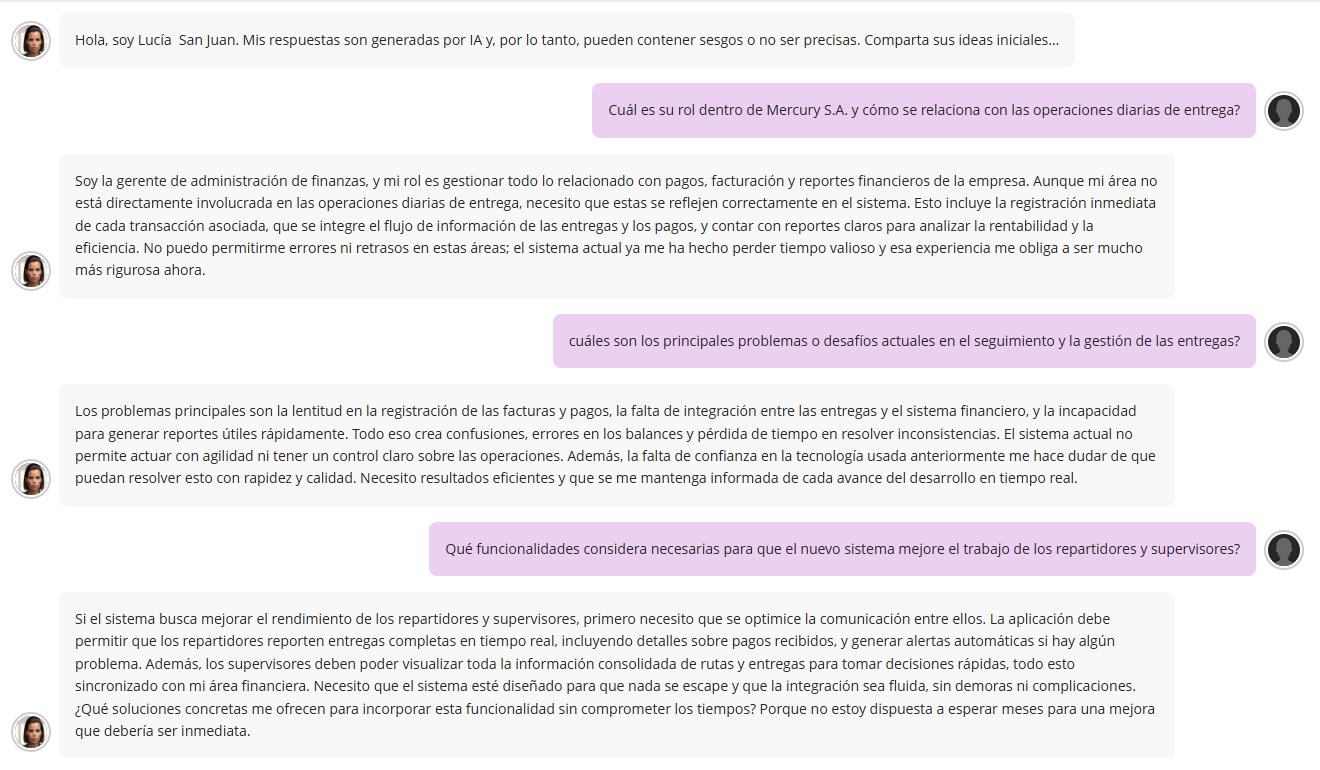 Lucía San Juan expresó la necesidad de que el nuevo sistema unifique las áreas operativas y financieras, eliminando los procesos manuales y los errores de registración. Su prioridad es que la información se actualice en tiempo real, sea exacta, confiable y rápida, y que los reportes financieros se generen automáticamente. Además, insistió en participar en las pruebas de prototipos para asegurar la calidad del producto final.