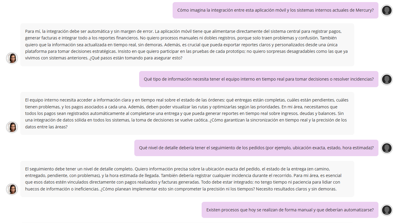 El escenario La empresa Mercury S.A., dedicada a servicios de logística y distribución en entornos urbanos, ha decidido desarrollar una nueva aplicación móvil que permita a sus clientes realizar el seguimiento en tiempo real de los pedidos, gestionar reclamos y calificar el servicio recibido. El sistema también debe integrarse con las operaciones internas para facilitar la asignación de rutas, el control de entregas y la retroalimentación de los repartidores. Actualmente, el proyecto se encuentra en la fase de inicio, y se requiere realizar la elicitación de requerimientos. La empresa contrató a una consultora especializada en sistemas de información para esta tarea. El proceso se llevará a cabo mediante entrevistas individuales a distintos actores involucrados en el sistema. Cada actor tiene una visión parcial y plantea prioridades, restricciones y lenguaje propios. El rol del estudiante en el escenario El/la estudiante asumirá el rol de Analista Funcional dentro del equipo consultor externo contratado por Mercury S.A. Su responsabilidad es llevar a cabo entrevistas efectivas con distintos actores del proyecto, con el objetivo de: Identificar requerimientos funcionales y no funcionales del sistema. Detectar conflictos, vacíos, ambigüedades o contradicciones en los requerimientos planteados por los distintos perfiles. Formular preguntas claras, adaptando el lenguaje y la profundidad técnica según el perfil de cada interlocutor. Sistematizar y documentar los requerimientos obtenidos en un informe inicial. El/la estudiante deberá aplicar herramientas y enfoques propios de la disciplina, como entrevistas estructuradas, mapeo de requerimientos, redacción de historias de usuario, criterios de aceptación o clasificaciones según el estándar IEEE También se espera que desarrolle habilidades blandas clave: escucha activa, reformulación, empatía, manejo de interrupciones y claridad comunicacional.